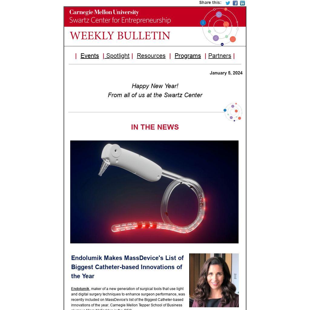 Have startup news or opportunities to share? Have questions about the Swartz Center Weekly Bulletin? Send news, opportunities or questions to Sonya Ford, Program Manager.