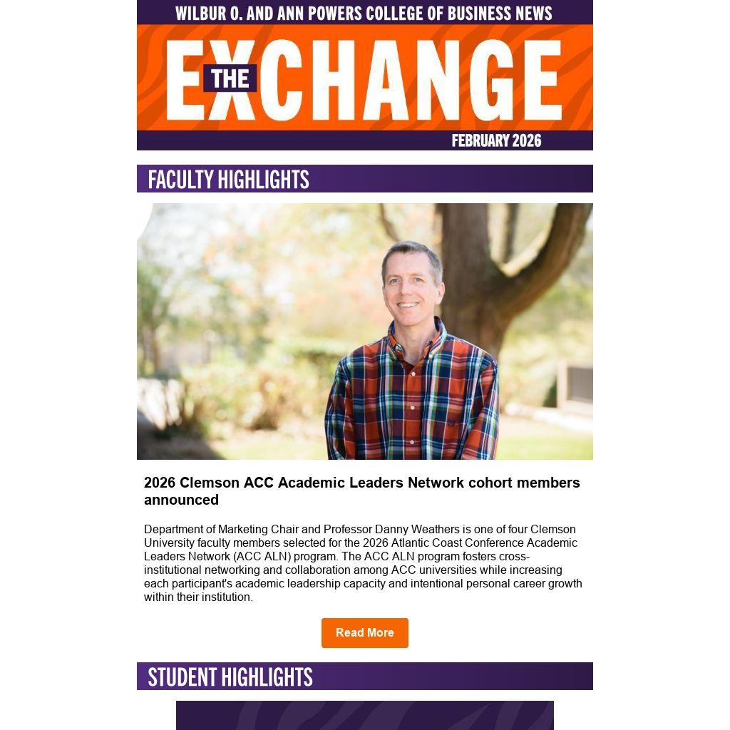 Department of Marketing Chair and Professor Danny Weathers is one of four Clemson University faculty members selected for the 2026 Atlantic Coast Conference Academic Leaders Network (ACC ALN) program. The ACC ALN program fosters cross-institutional networking and collaboration among ACC universities while increasing each participant's academic leadership capacity and intentional personal career growth within their institution.