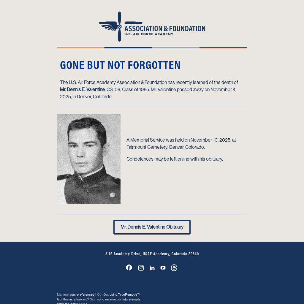 The U.S. Air Force Academy Association & Foundation has recently learned of the death of Mr. Dennis E. Valentine, CS-09, Class of 1965. Mr. Valentine passed away on November 4, 2025, in Denver, Colorado.