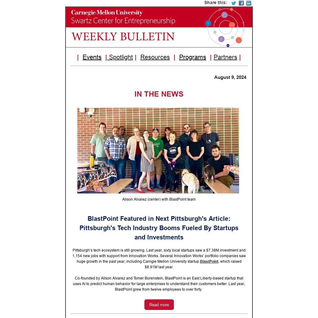 Have startup news or opportunities to share? Have questions about the Swartz Center Weekly Bulletin? Send news, opportunities or questions to Sonya Ford, Program Manager.