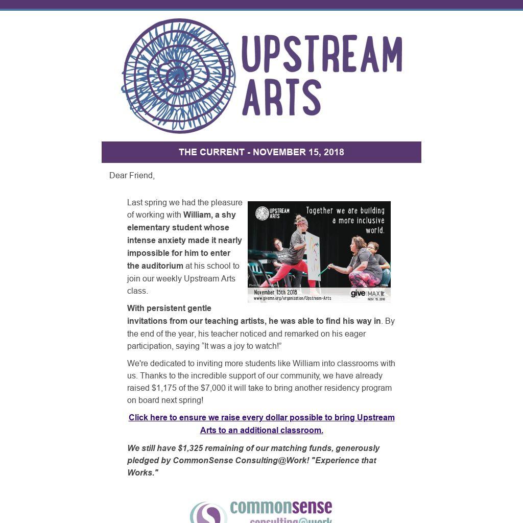 Last spring we had the pleasure of working with William, a shy elementary student whose intense anxiety made it nearly impossible for him to enter the auditorium at his school to join our weekly Upstream Arts class.