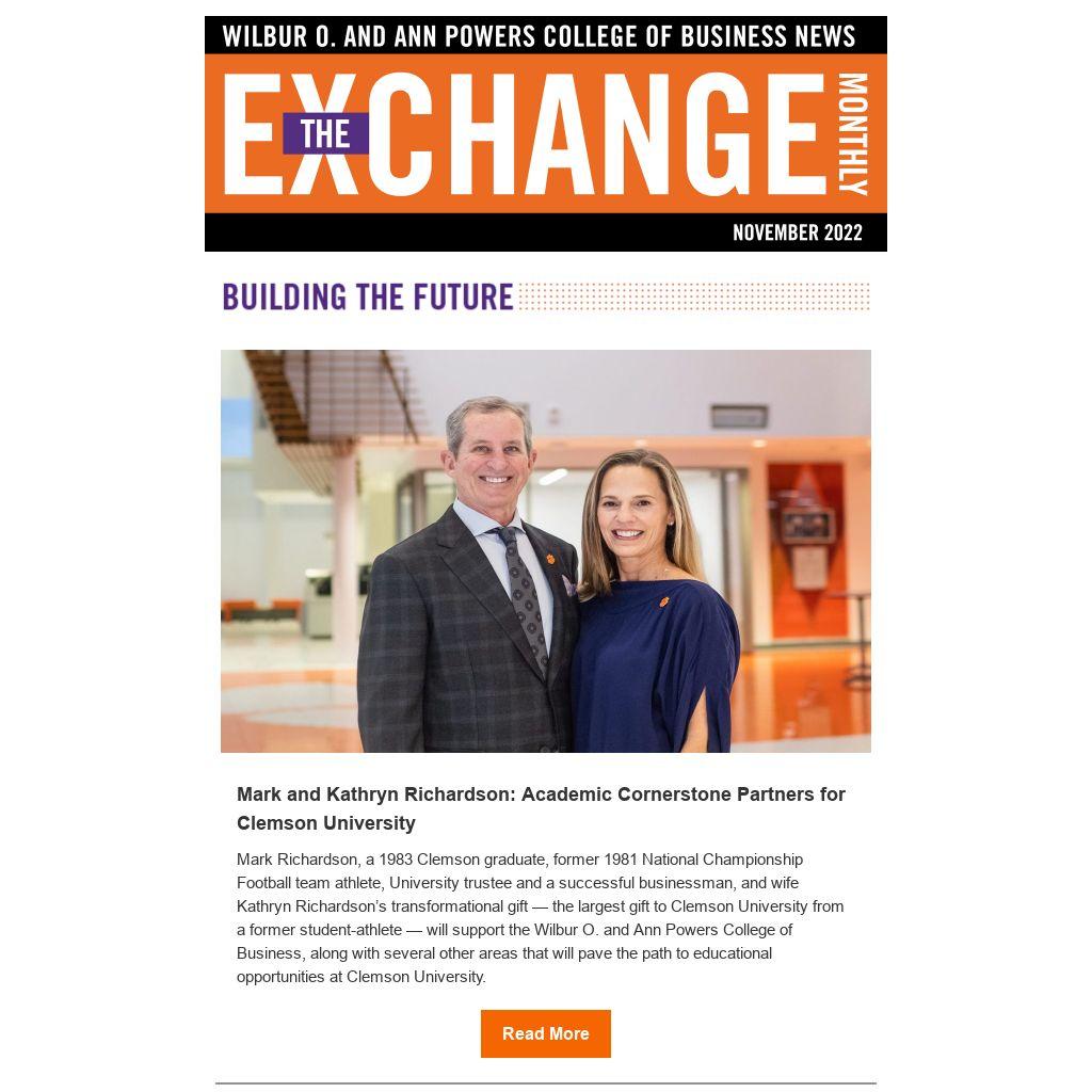 Mark Richardson, a 1983 Clemson graduate, former 1981 National Championship Football team athlete, University trustee and a successful businessman, and wife Kathryn Richardson’s transformational gift — the largest gift to Clemson University from a former student-athlete — will support the Wilbur O. and Ann Powers College of Business, along with several other areas that will pave the path to educational opportunities at Clemson University.