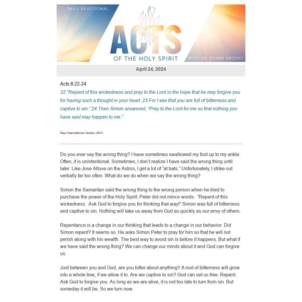 Simon the Samaritan said the wrong thing to the wrong person when he tried to purchase the power of the Holy Spirit. Peter did not mince words: “Repent of this wickedness. Ask God to forgive you for thinking that way!” Simon was full of bitterness and captive to sin. Nothing will take us away from God as quickly as our envy of others.