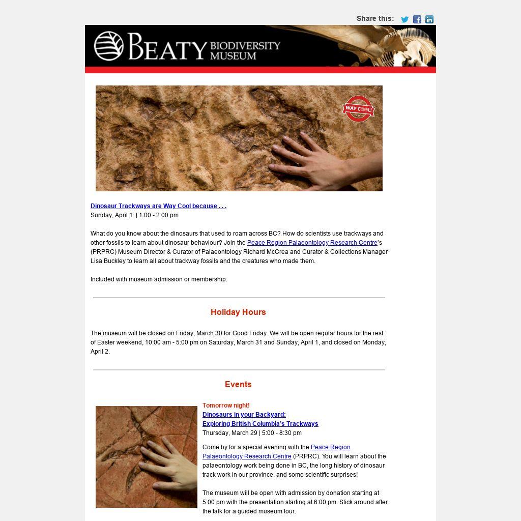 Come by for a special evening with the Peace Region Palaeontology Research Centre (PRPRC). You will learn about the palaeontology work being done in BC, the long history of dinosaur track work in our province, and some scientific surprises!