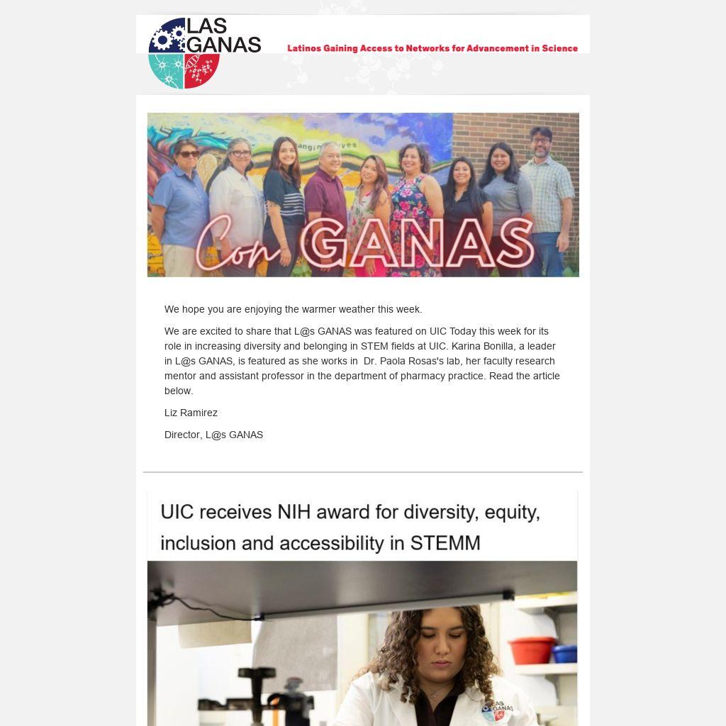 We are excited to share that L@s GANAS was featured on UIC Today this week for its role in increasing diversity and belonging in STEM fields at UIC. Karina Bonilla, a leader in L@s GANAS, is featured as she works in Dr. Paola Rosas's lab, her faculty research mentor and assistant professor in the department of pharmacy practice. Read the article below.