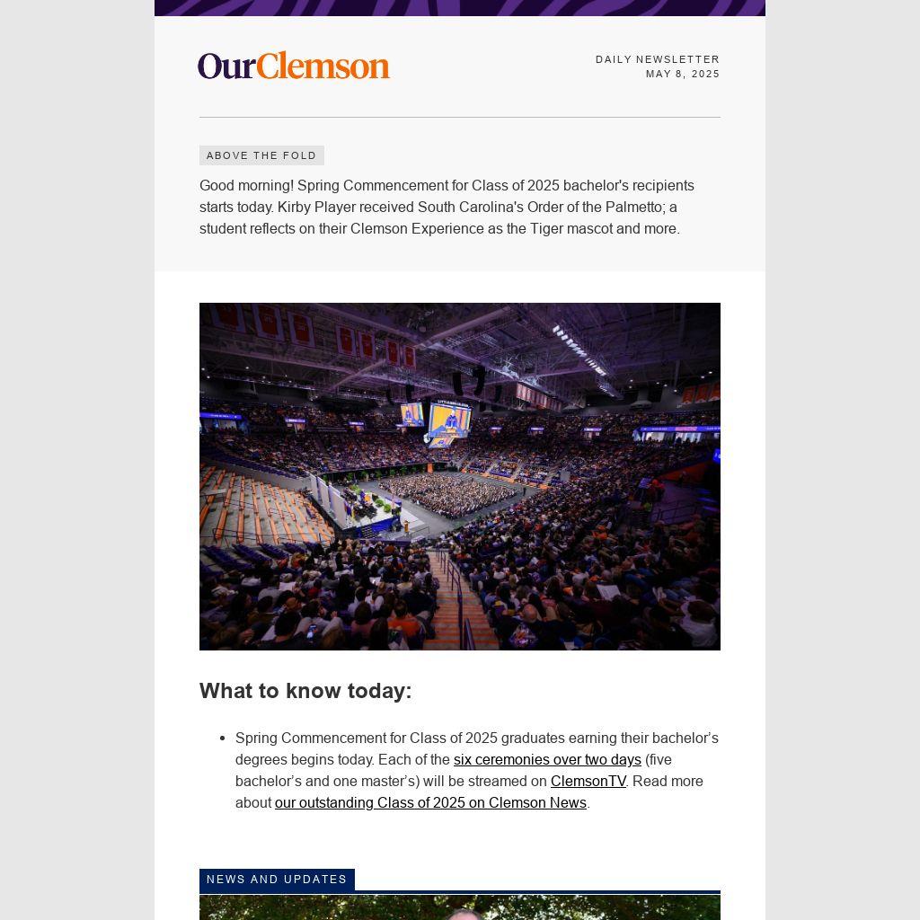 Good morning! Spring Commencement for Class of 2025 bachelor's recipients starts today. Kirby Player received South Carolina's Order of the Palmetto; a student reflects on their Clemson Experience as the Tiger mascot and more.
