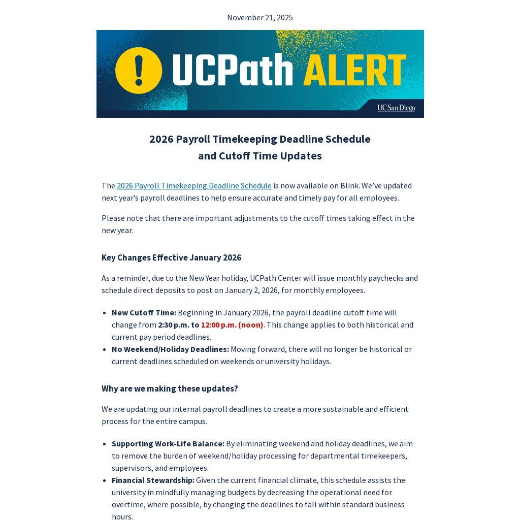 As a reminder, due to the New Year holiday, UCPath Center will issue monthly paychecks and schedule direct deposits to post on January 2, 2026, for monthly employees.