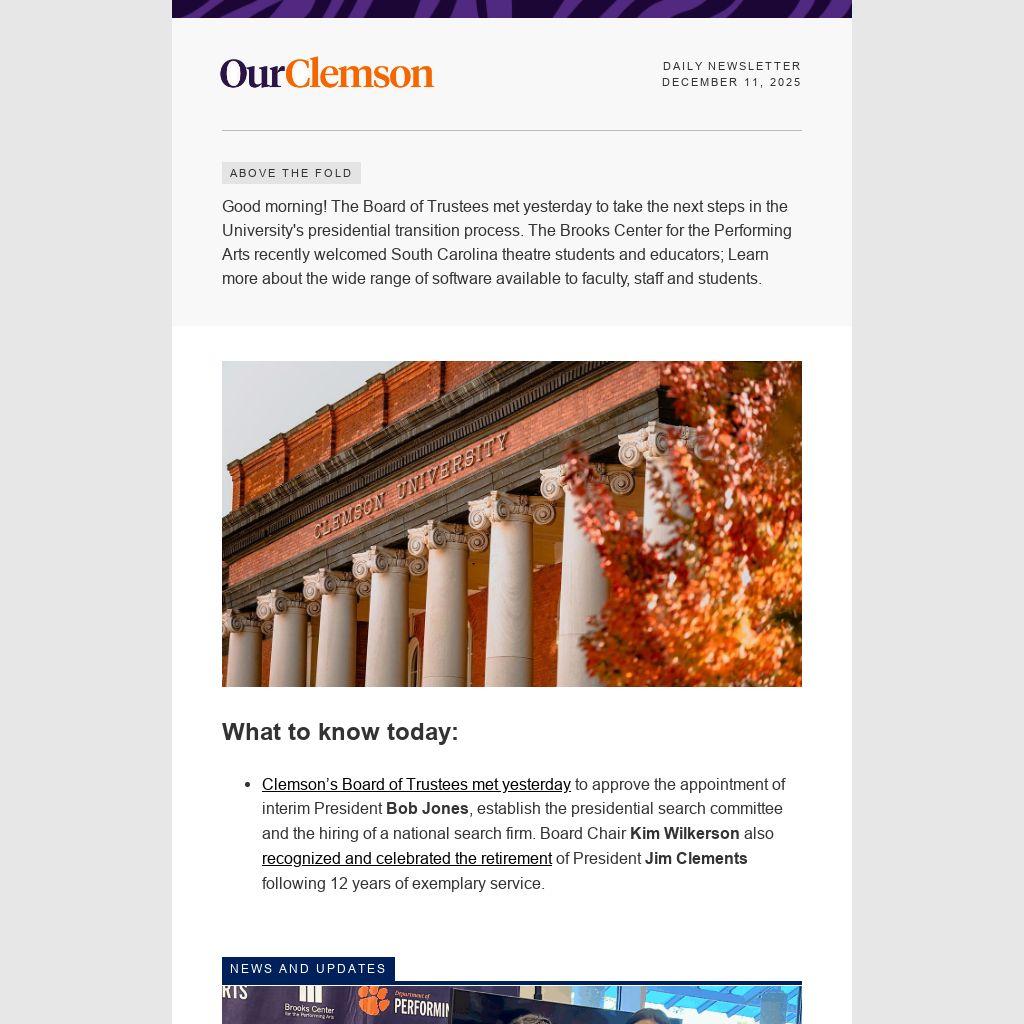 Good morning! The Board of Trustees met yesterday to take the next steps in the University's presidential transition process. The Brooks Center for the Performing Arts recently welcomed South Carolina theatre students and educators; Learn more about the wide range of software available to faculty, staff and students.