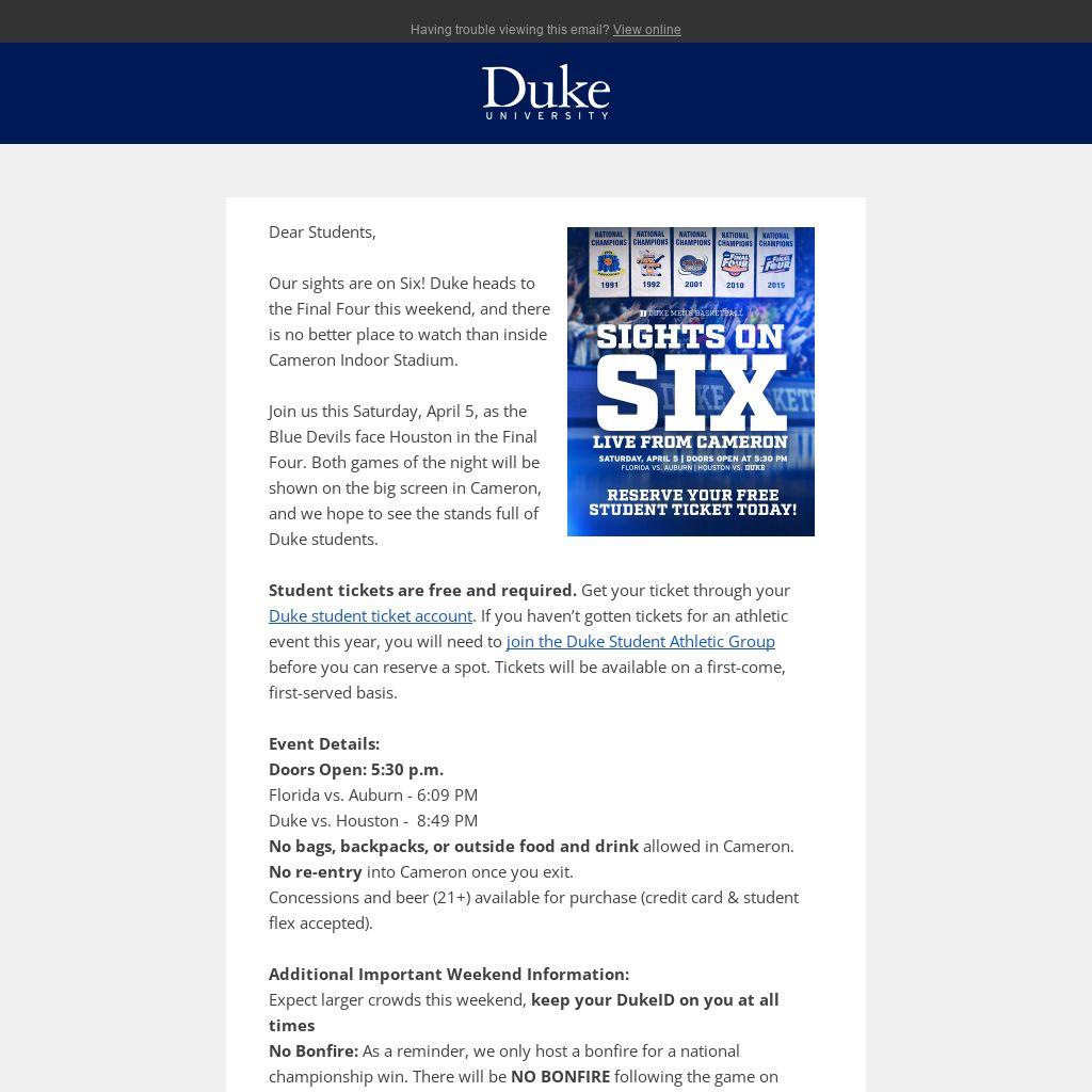 Join us this Saturday, April 5, as the Blue Devils face Houston in the Final Four. Both games of the night will be shown on the big screen in Cameron, and we hope to see the stands full of Duke students.