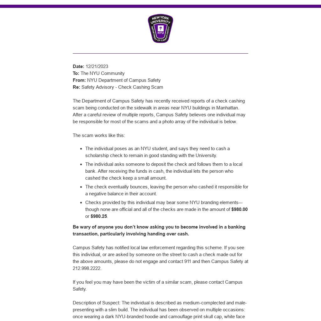 Campus Safety has notified local law enforcement regarding this scheme. If you see this individual, or are asked by someone on the street to cash a check made out for the above amounts, please do not engage and contact 911 and then Campus Safety at 212.998.2222.