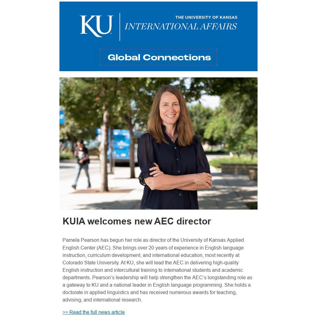 Pamela Pearson has begun her role as director of the University of Kansas Applied English Center (AEC). She brings over 20 years of experience in English language instruction, curriculum development, and international education, most recently at Colorado State University. At KU, she will lead the AEC in delivering high-quality English instruction and intercultural training to international students and academic departments. Pearson’s leadership will help strengthen the AEC’s longstanding role as a gateway to KU and a national leader in English language programming. She holds a doctorate in applied linguistics and has received numerous awards for teaching, advising, and international research.