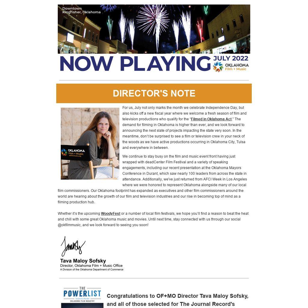 We continue to stay busy on the film and music event front having just wrapped with deadCenter Film Festival and a variety of speaking engagements, including our recent presentation at the Oklahoma Mayors Conference in Durant, which saw nearly 100 leaders from across the state in attendance. Additionally, we've just returned from AFCI Week in Los Angeles where we were honored to represent Oklahoma alongside many of our local film commissioners. Our Oklahoma footprint has expanded as executives and other film commissioners around the world are hearing about the growth of our film and television industries and our rise in becoming top of mind as a filming production hub.