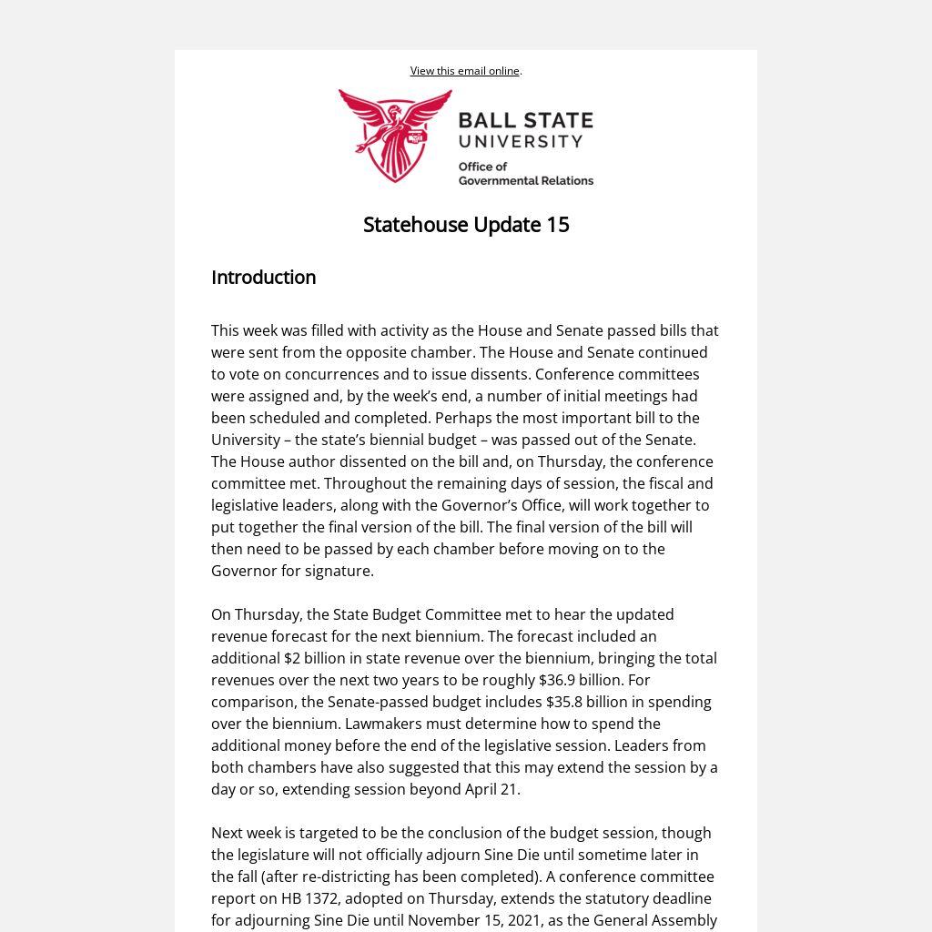 Please see below for a list of bills being tracked by Ball State Governmental Relations that have moved during the last week. As always, if you have any questions, please reach out to our office at gov@bsu.edu.