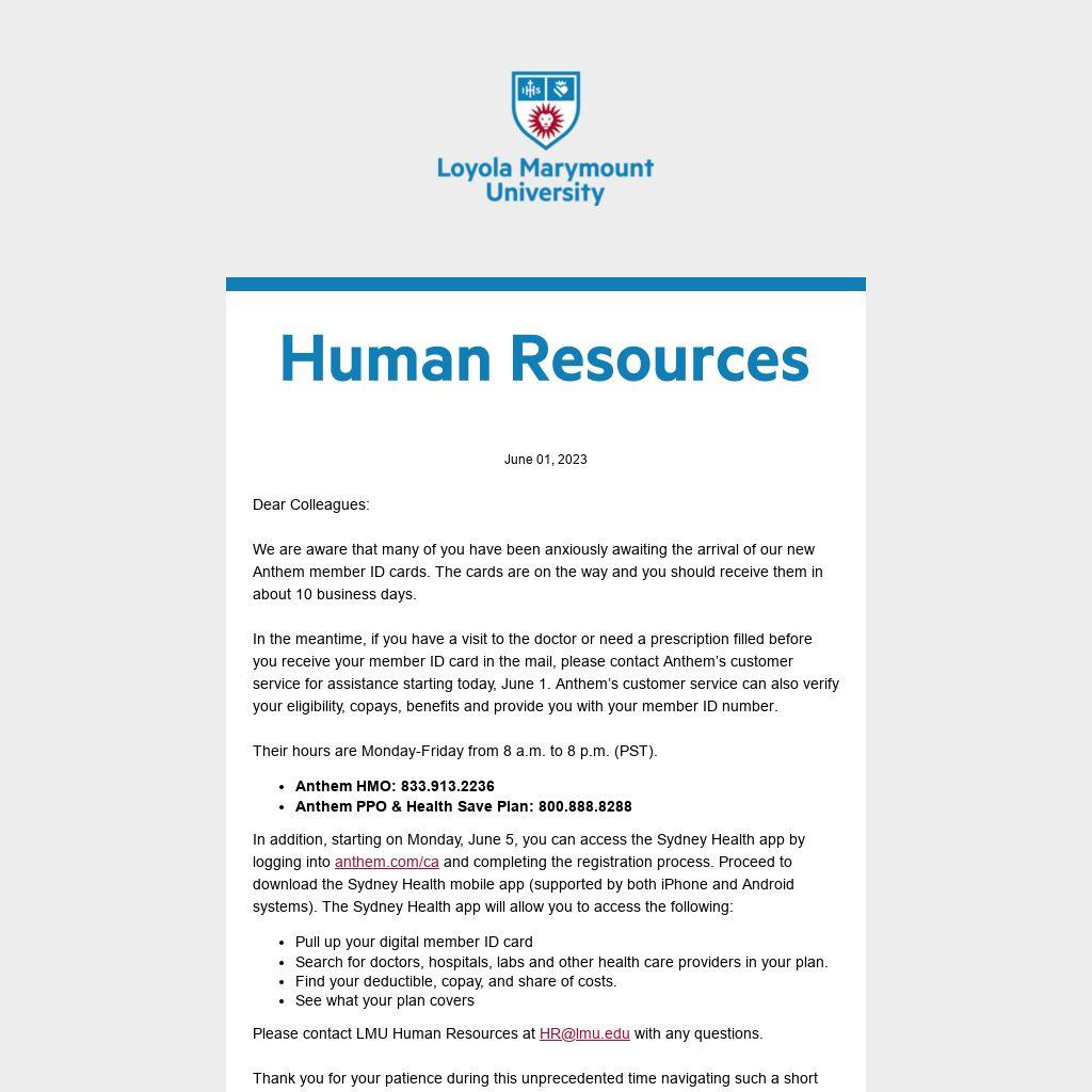 Please contact LMU Human Resources at HR@lmu.edu with any questions.
