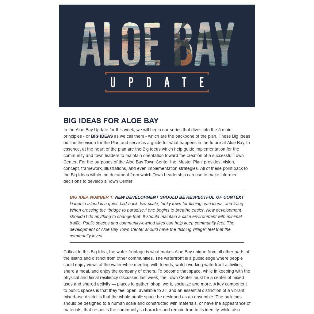 In the Aloe Bay Update for this week, we will begin our series that dives into the 5 main principles - or BIG IDEAS as we call them - which are the backbone of the plan. These Big Ideas outline the vision for the Plan and serve as a guide for what happens in the future at Aloe Bay. In essence, at the heart of the plan are the Big Ideas which help guide implementation for the community and town leaders to maintain orientation toward the creation of a successful Town Center. For the purposes of the Aloe Bay Town Center the ‘Master Plan’ provides; vision, concept, framework, illustrations, and even implementation strategies. All of these point back to the Big Ideas within the document from which Town Leadership can use to make informed decisions to develop a Town Center.