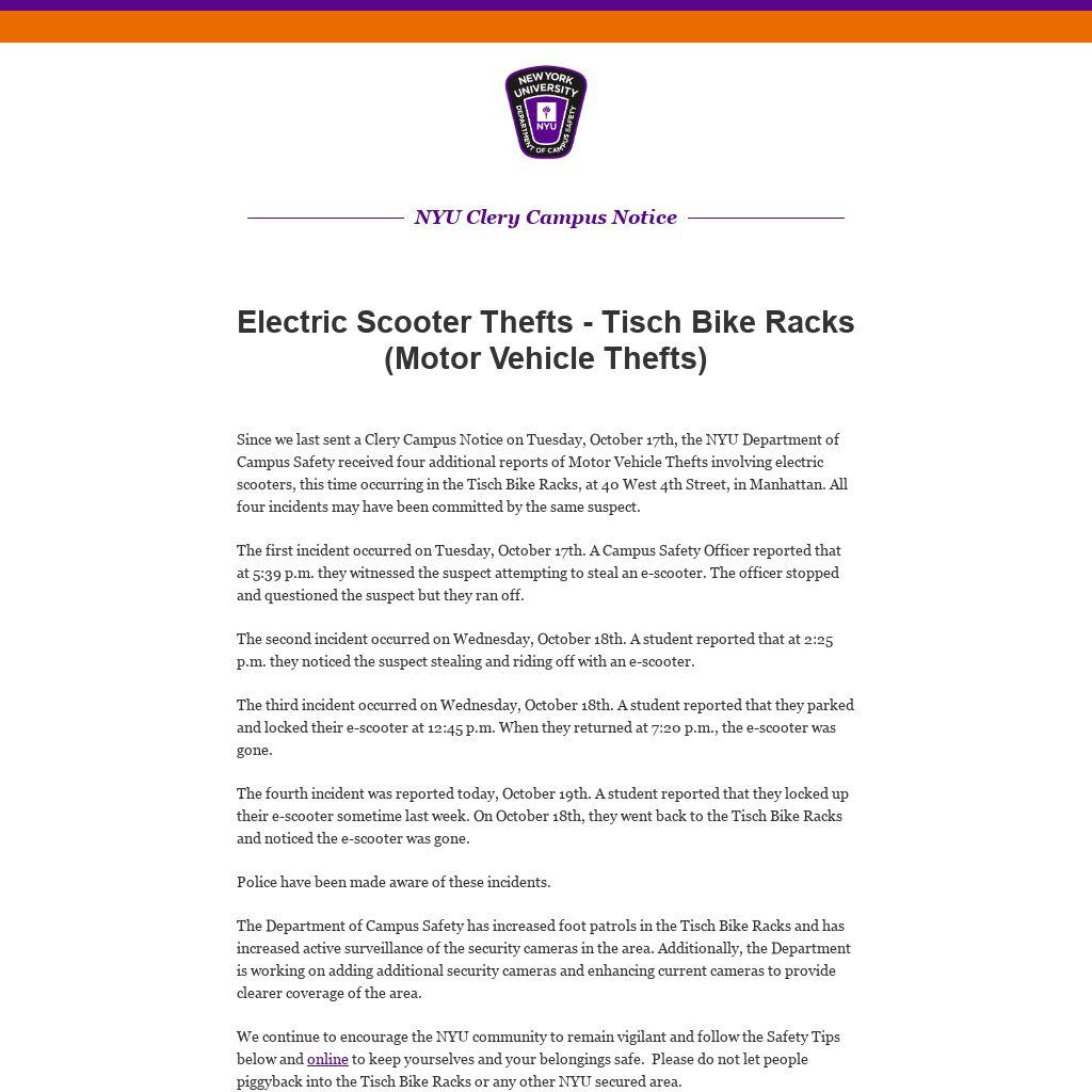 Since we last sent a Clery Campus Notice on Tuesday, October 17th, the NYU Department of Campus Safety received four additional reports of Motor Vehicle Thefts involving electric scooters, this time occurring in the Tisch Bike Racks, at 40 West 4th Street, in Manhattan. All four incidents may have been committed by the same suspect.