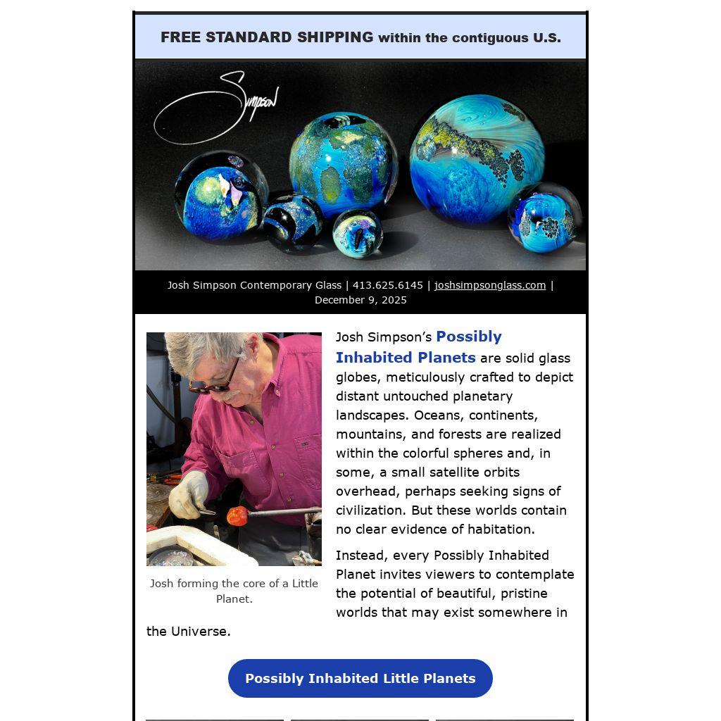 Josh Simpson’s Possibly Inhabited Planets are solid glass globes, meticulously crafted to depict distant untouched planetary landscapes. Oceans, continents, mountains, and forests are realized within the colorful spheres and, in some, a small satellite orbits overhead, perhaps seeking signs of civilization. But these worlds contain no clear evidence of habitation.Â
