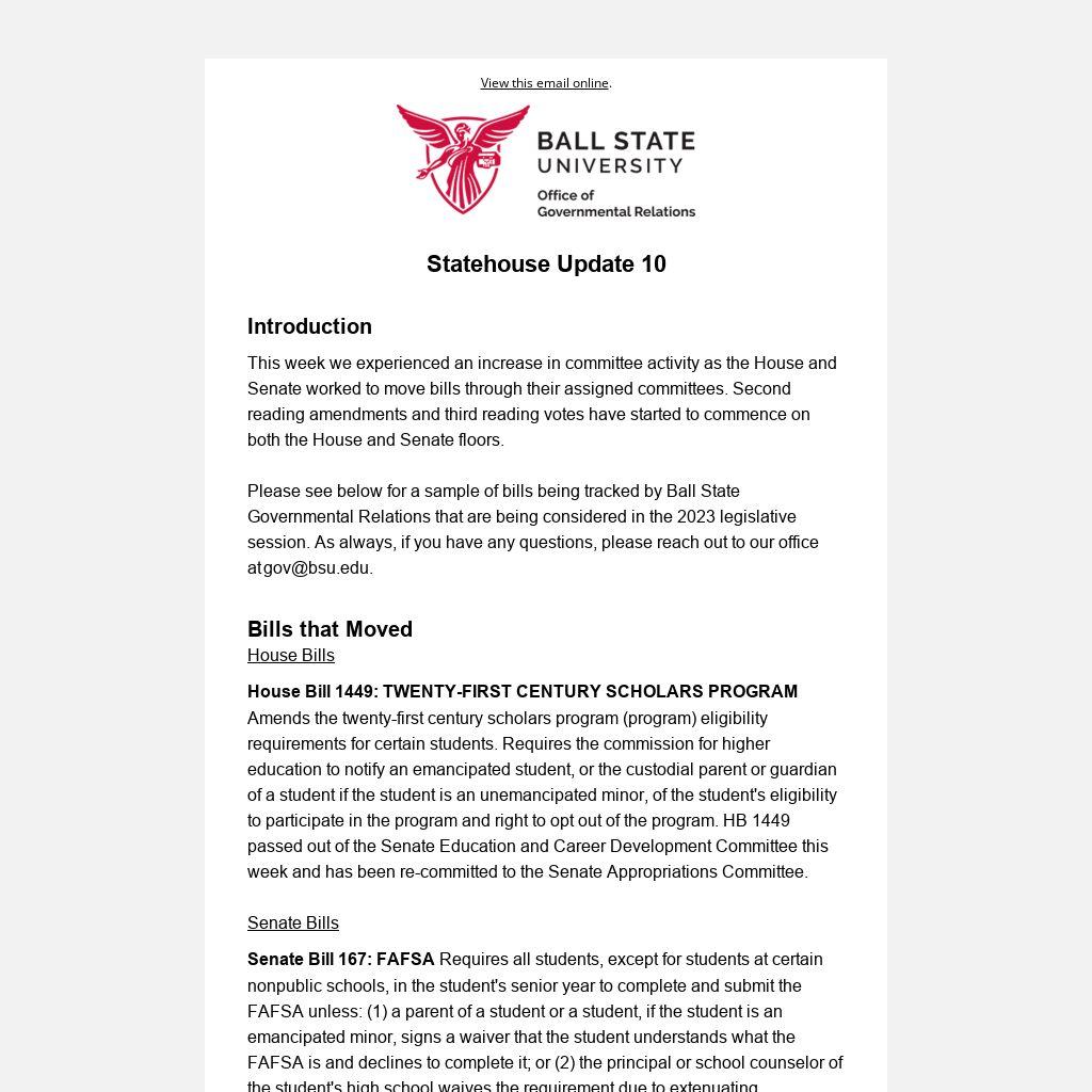 Please see below for a sample of bills being tracked by Ball State Governmental Relations that are being considered in the 2023 legislative session. As always, if you have any questions, please reach out to our office at gov@bsu.edu.