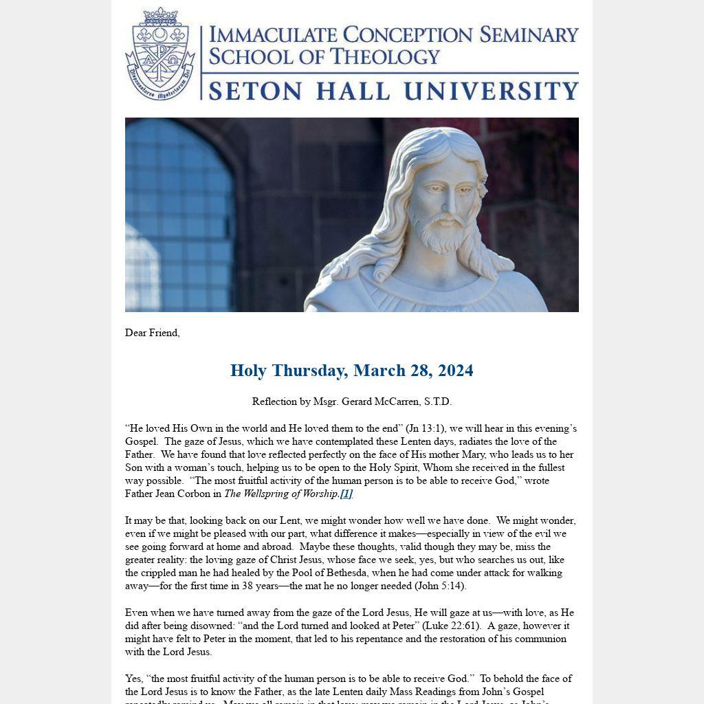 An aspect of that good is that the One Who was “to gather into one the dispersed children of God” (John 11:52) through His Blood to be shed on the Cross (Eucharistic Prayer for Reconciliation I), has brought us all together in these reflections this Lent—and to the extent that we have listened from the heart (see the Rule of Saint Benedict, 1:1) has ushered us into deeper communion as members of the Body of Christ and in the communion of the Father, the Son and the Holy Spirit. May we give thanks to the Lord Jesus as we enter into the Paschal Triduum this evening. I give thanks for all of you who have participated in these weeks together with the community of Immaculate Conception Seminary, and in a particular way to our reflection leaders, Monsignor Joseph Reilly and Dr. Dianne Traflet.
