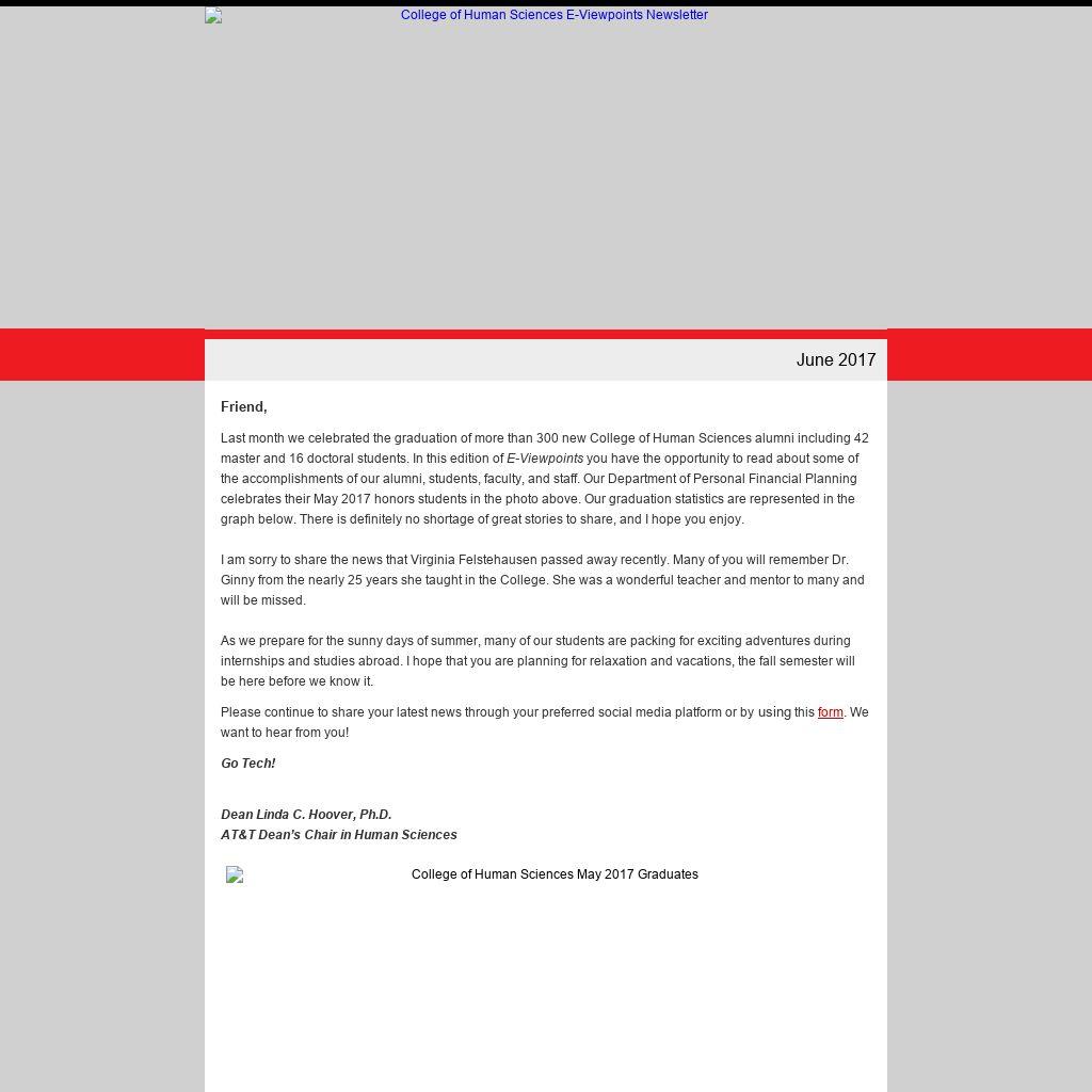 Friend, Last month we celebrated the graduation of more than 300 new College of Human Sciences alumni including 42 master and 16 doctoral students. In this edition of E-Viewpoints you have the opportunity to read about some of the accomplishments of our alumni, students, faculty, and staff. Our Department of Personal Financial Planning celebrates their May 2017 honors students in the photo above. Our graduation statistics are represented in the graph below. There is definitely no shortage of great stories to share, and I hope you enjoy.
