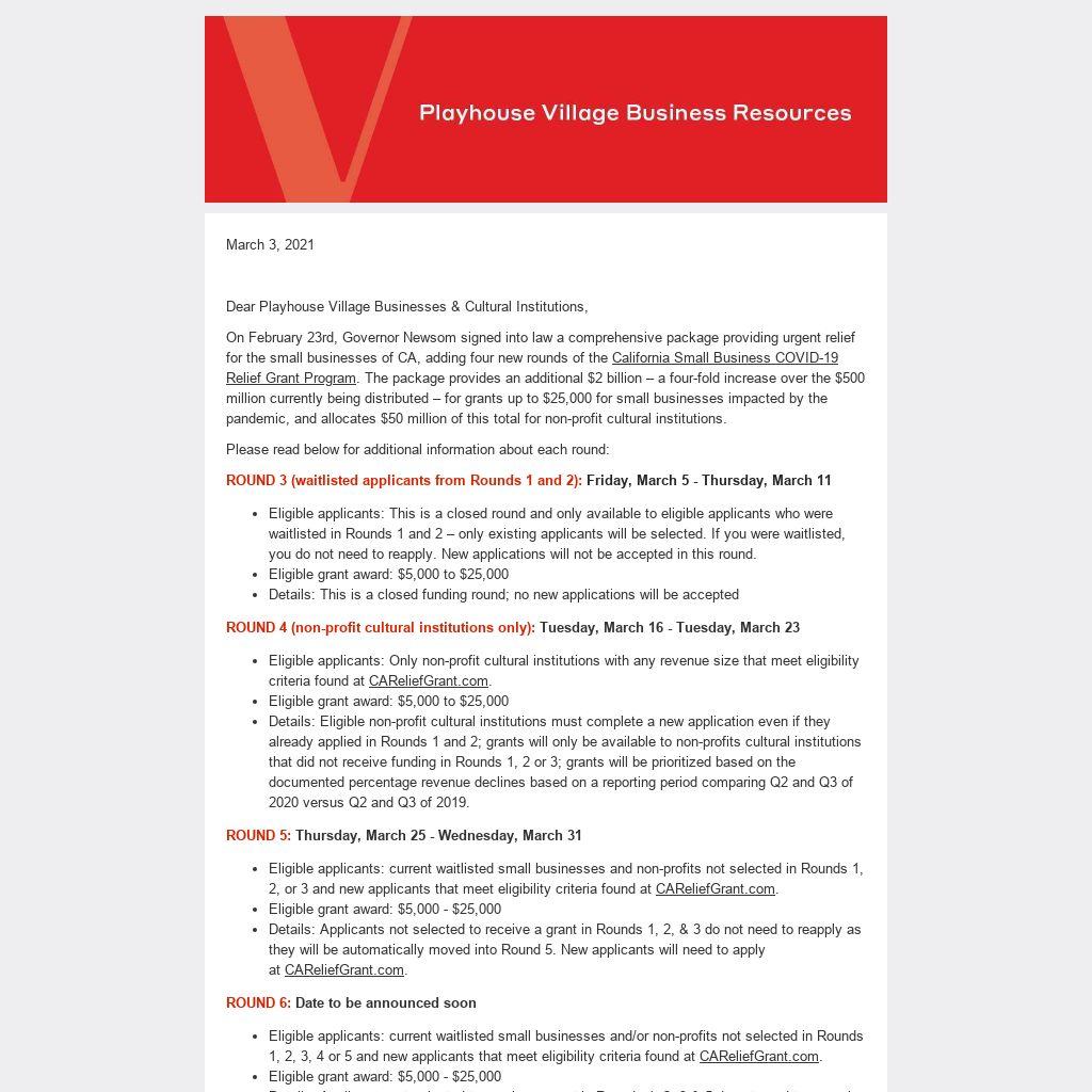 On February 23rd, Governor Newsom signed into law a comprehensive package providing urgent relief for the small businesses of CA, adding four new rounds of the California Small Business COVID-19 Relief Grant Program. The package provides an additional $2 billion – a four-fold increase over the $500 million currently being distributed – for grants up to $25,000 for small businesses impacted by the pandemic, and allocates $50 million of this total for non-profit cultural institutions.