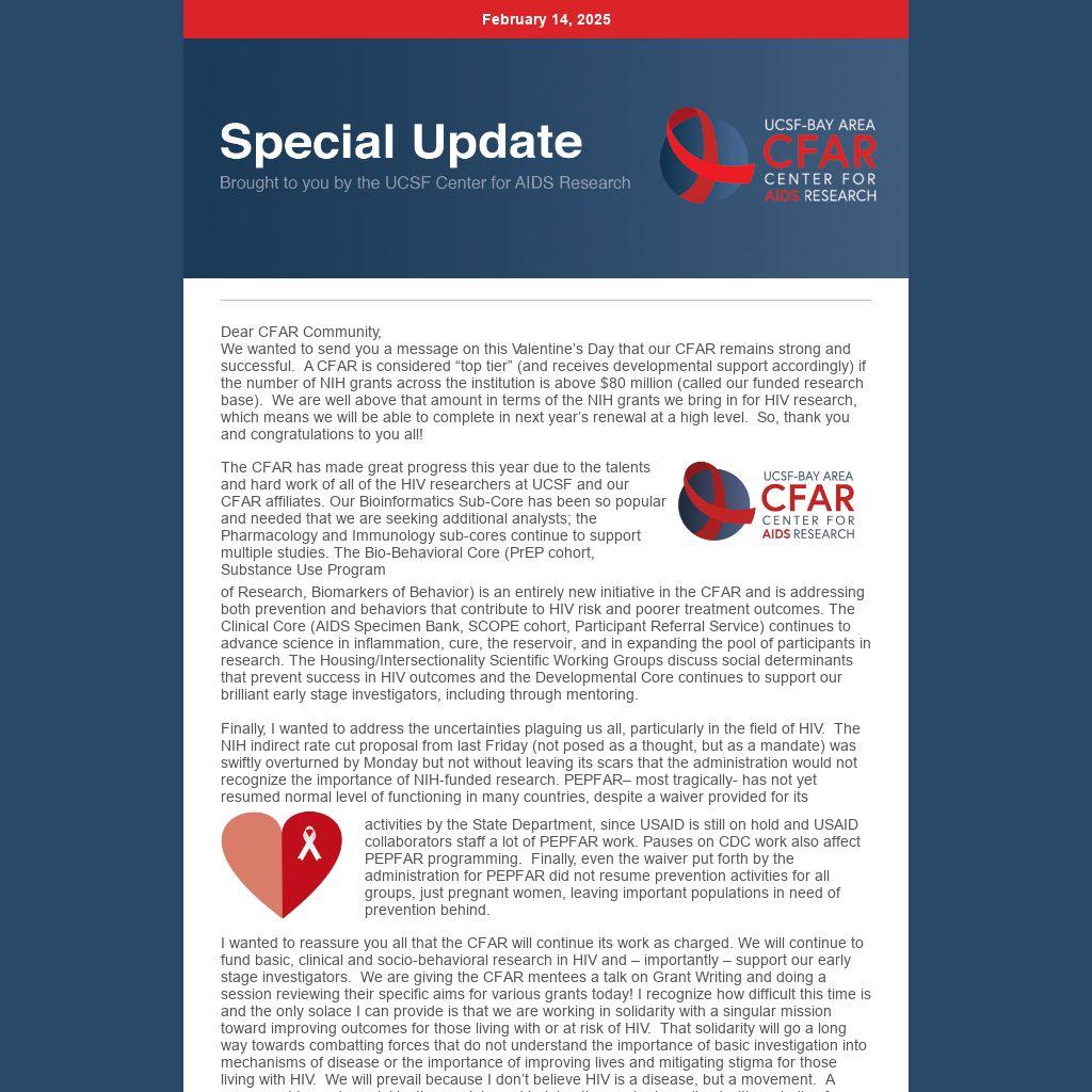 We wanted to send you a message on this Valentine’s Day that our CFAR remains strong and successful. A CFAR is considered “top tier” (and receives developmental support accordingly) if the number of NIH grants across the institution is above $80 million (called our funded research base). We are well above that amount in terms of the NIH grants we bring in for HIV research, which means we will be able to complete in next year’s renewal at a high level. So, thank you and congratulations to you all!