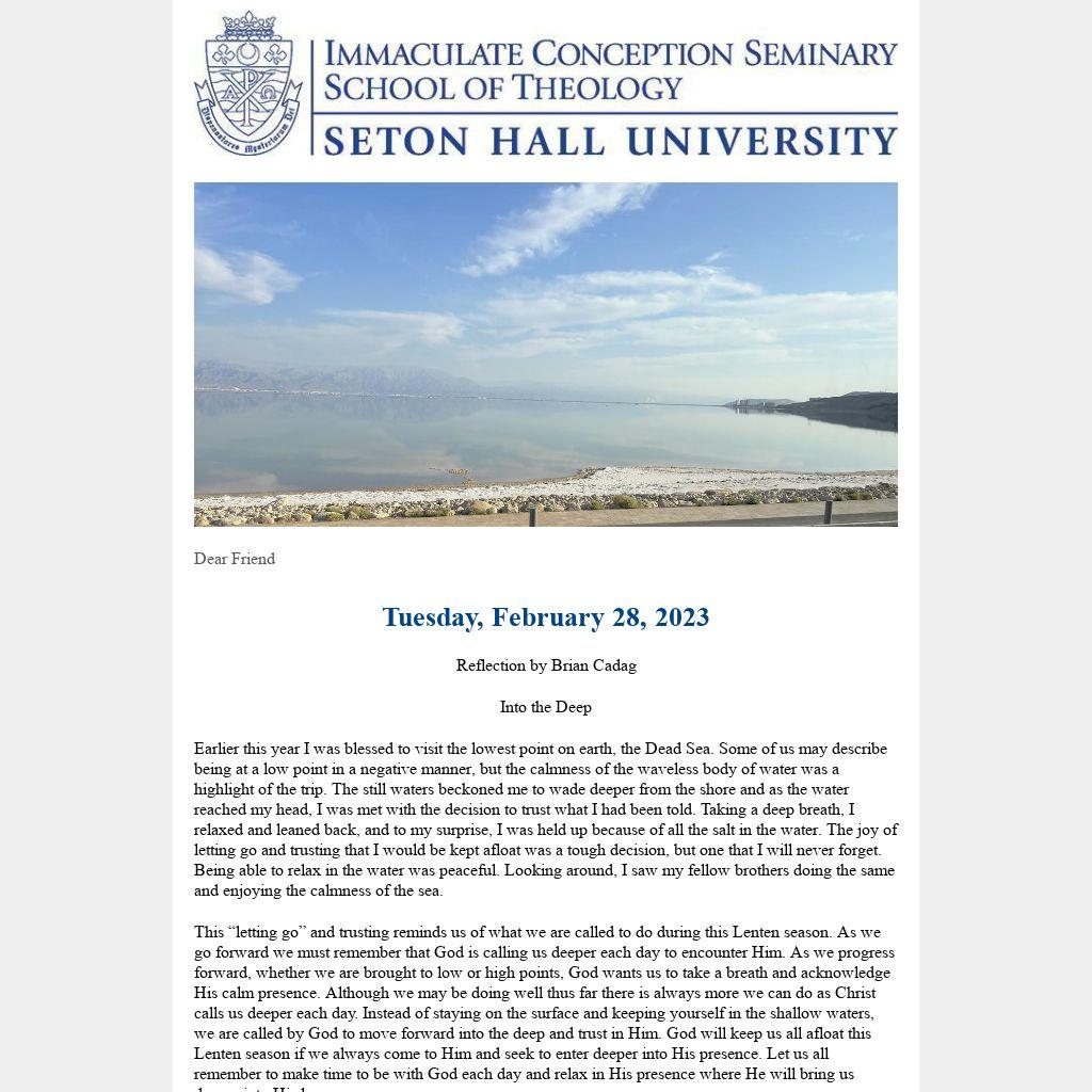 This “letting go” and trusting reminds us of what we are called to do during this Lenten season. As we go forward we must remember that God is calling us deeper each day to encounter Him. As we progress forward, whether we are brought to low or high points, God wants us to take a breath and acknowledge His calm presence. Although we may be doing well thus far there is always more we can do as Christ calls us deeper each day. Instead of staying on the surface and keeping yourself in the shallow waters, we are called by God to move forward into the deep and trust in Him. God will keep us all afloat this Lenten season if we always come to Him and seek to enter deeper into His presence. Let us all remember to make time to be with God each day and relax in His presence where He will bring us deeper into His love.