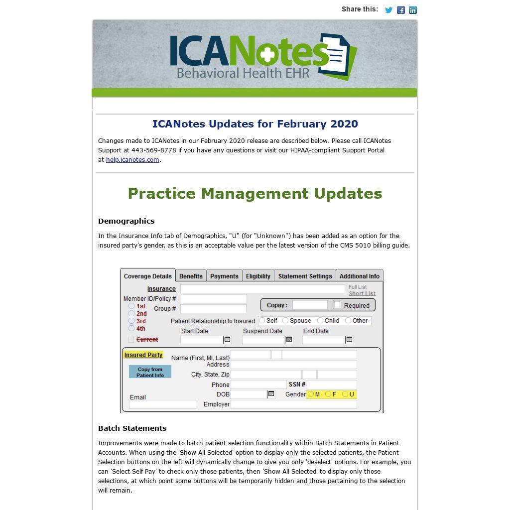 Changes made to ICANotes in our February 2020 release are described below. Please call ICANotes Support at 443-569-8778 if you have any questions or visit our HIPAA-compliant Support Portal at help.icanotes.com.