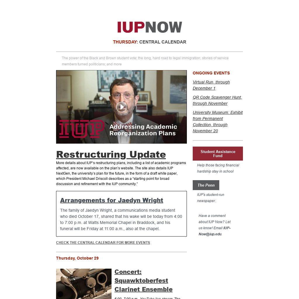 Distributed to IUP employees and students four days a week, IUP Now is the official newsletter of Indiana University of Pennsylvania. It features news from across the IUP website, compiled by the Division of Marketing and Communications. Find out how to get your news and events in IUP Now.