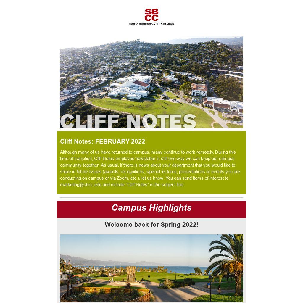 Although many of us have returned to campus, many continue to work remotely. During this time of transition, Cliff Notes employee newsletter is still one way we can keep our campus community together. As usual, if there is news about your department that you would like to share in future issues (awards, recognitions, special lectures, presentations or events you are conducting on campus or via Zoom, etc.), let us know. You can send items of interest to marketing@sbcc.edu and include “Cliff Notes” in the subject line.