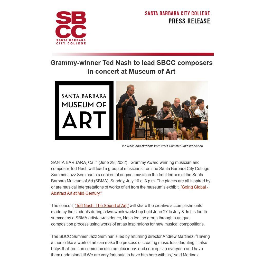 SANTA BARBARA, Calif. (June 29, 2022) - Grammy Award-winning musician and composer Ted Nash will lead a group of musicians from the Santa Barbara City College Summer Jazz Seminar in a concert of original music on the front terrace of the Santa Barbara Museum of Art (SBMA), Sunday, July 10 at 3 p.m. The pieces are all inspired by or are musical interpretations of works of art from the museum’s exhibit, “Going Global - Abstract Art at Mid-Century.” The concert, “Ted Nash: The Sound of Art,” will share the creative accomplishments made by the students during a two-week workshop held June 27 to July 8. In his fourth summer as a SBMA artist-in-residence, Nash led the group through a unique composition process using works of art as inspirations for new musical compositions.