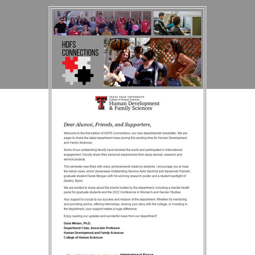 Welcome to the first edition of HDFS Connections, our new departmental newsletter. We are eager to share the latest department news during this exciting time for Human Development and Family Sciences.