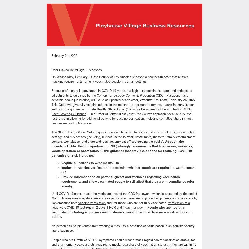 On Wednesday, February 23, the County of Los Angeles released a new health order that relaxes masking requirements for fully vaccinated people in certain settings. Because of steady improvement in COVID-19 metrics, a high local vaccination rate, and anticipated adjustments to guidance by the Centers for Disease Control & Prevention (CDC), Pasadena, as a separate health jurisdiction, will issue an updated health order, effective Saturday, February 26, 2022. This Order will give fully vaccinated people the option to either wear or remove masks in many indoor settings in alignment with State Health Officer Order (California Department of Public Health (CDPH) Face Covering Guidance). This Order will differ slightly from the County approach because it is less restrictive in allowing for additional options for vaccine verification, including self-attestation, in most businesses and public areas. The State Health Officer Order requires anyone who is not fully vaccinated to mask in all indoor public settings and businesses (including, but not limited to retail, restaurants, theaters, family entertainment centers, workplaces, and state and local government offices serving the public). As such, the Pasadena Public Health Department (PPHD) strongly recommends that businesses, worksites, venue operators or hosts follow CDPH guidance that provides options for reducing COVID-19 transmission risk including: