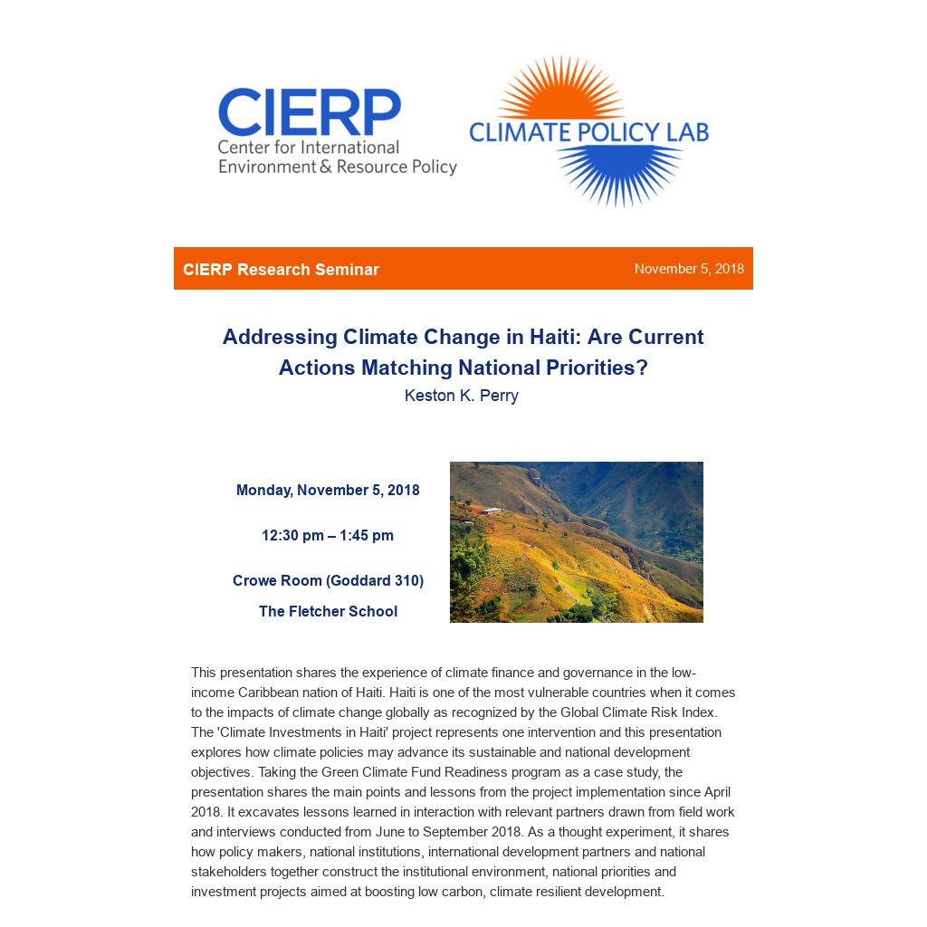 This presentation shares the experience of climate finance and governance in the low-income Caribbean nation of Haiti. Haiti is one of the most vulnerable countries when it comes to the impacts of climate change globally as recognized by the Global Climate Risk Index. The 'Climate Investments in Haiti' project represents one intervention and this presentation explores how climate policies may advance its sustainable and national development objectives. Taking the Green Climate Fund Readiness program as a case study, the presentation shares the main points and lessons from the project implementation since April 2018. It excavates lessons learned in interaction with relevant partners drawn from field work and interviews conducted from June to September 2018. As a thought experiment, it shares how policy makers, national institutions, international development partners and national stakeholders together construct the institutional environment, national priorities and investment projects aimed at boosting low carbon, climate resilient development.