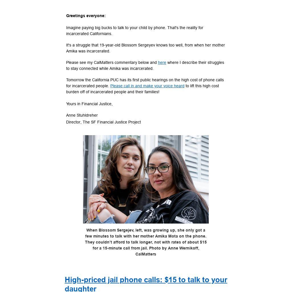 Now it’s the California Public Utilities Commission's turn to put people before profits to lift this burden off desperate families across the state. If the CPUC significantly lowers prices for families, it will make it easier for state and local officials to do what San Francisco and San Diego did – make the phone calls free.