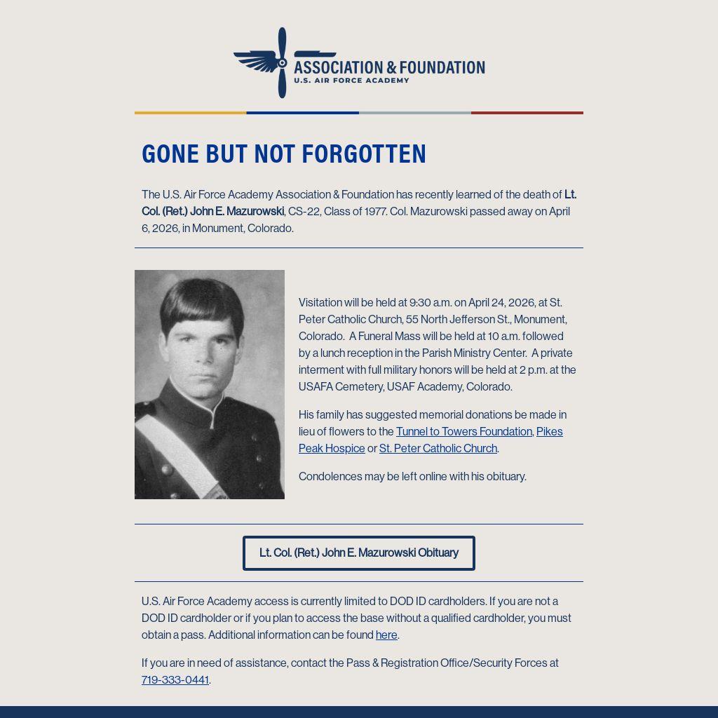 The U.S. Air Force Academy Association & Foundation has recently learned of the death of Lt. Col. (Ret.) John E. Mazurowski, CS-22, Class of 1977. Col. Mazurowski passed away on April 6, 2026, in Monument, Colorado.