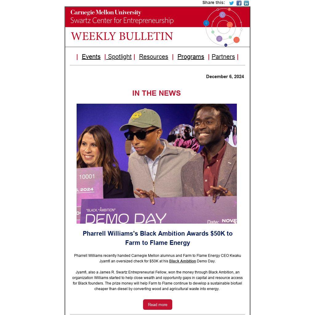 Have startup news or opportunities to share? Have questions about the Swartz Center Weekly Bulletin? Send news, opportunities or questions to Sonya Ford, Program Manager.