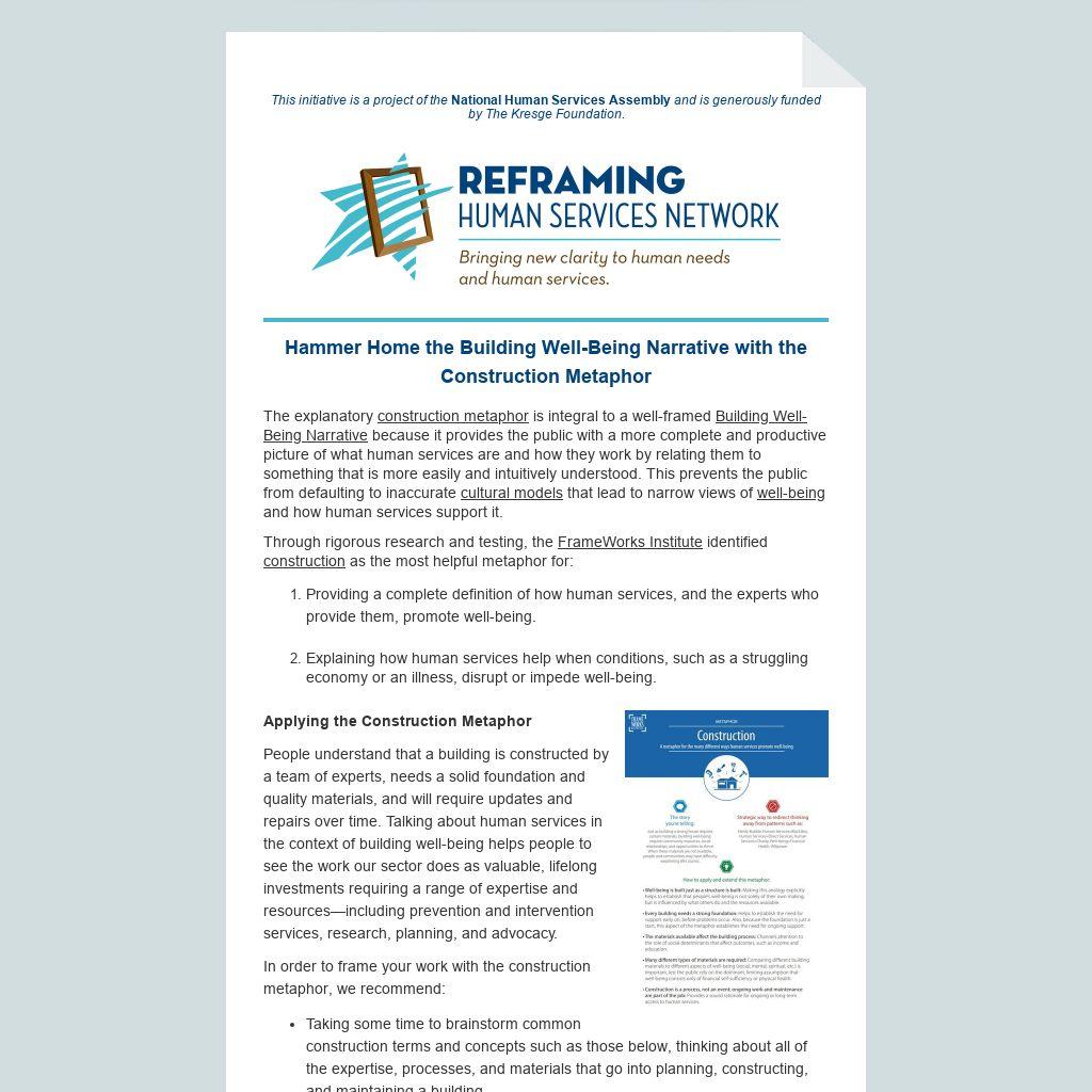 | Applying the Construction Metaphor People understand that a building is constructed by a team of experts, needs a solid foundation and quality materials, and will require updates and repairs over time. Talking about human services in the context of building well-being helps people to see the work our sector does as valuable, lifelong investments requiring a range of expertise and resources—including prevention and intervention services, research, planning, and advocacy. In order to frame your work with the construction metaphor, we recommend: - Taking some time to brainstorm common construction terms and concepts such as those below, thinking about all of the expertise, processes, and materials that go into planning, constructing, and maintaining a building