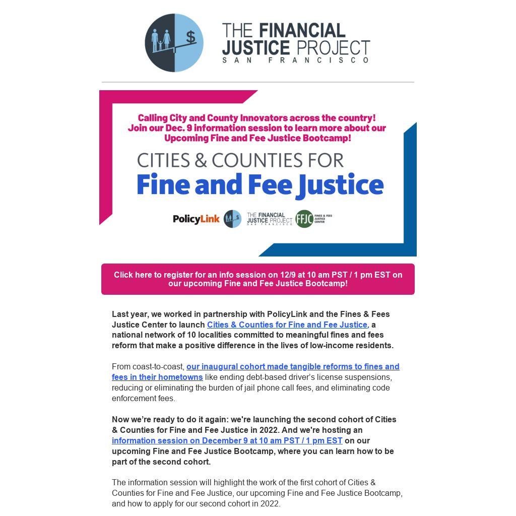 As always, we're thankful to our partners at PolicyLink and the Fines and Fees Justice Center for working with us to advance bold fine and fee reforms nationwide. And we're proud of the ten cities and counties in the first cohort who advanced fine and fee reforms in their hometowns.