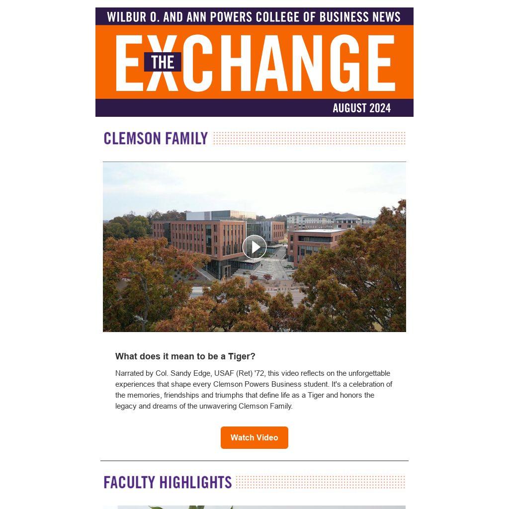 Narrated by Col. Sandy Edge, USAF (Ret) '72, this video reflects on the unforgettable experiences that shape every Clemson Powers Business student. It's a celebration of the memories, friendships and triumphs that define life as a Tiger and honors the legacy and dreams of the unwavering Clemson Family.