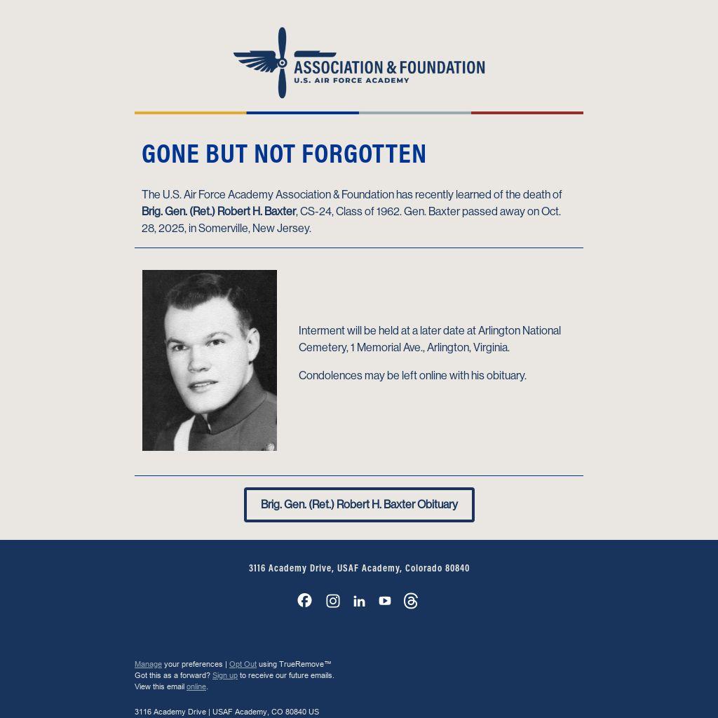 The U.S. Air Force Academy Association & Foundation has recently learned of the death of Brig. Gen. (Ret.) Robert H. Baxter, CS-24, Class of 1962. Gen. Baxter passed away on Oct. 28, 2025, in Somerville, New Jersey.