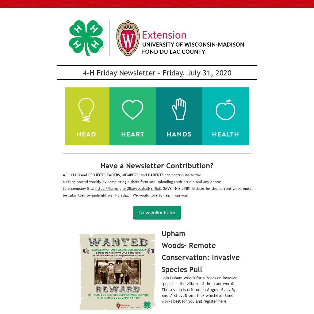 Upham Woods- Remote Conservation: Invasive Species Pull Join Upham Woods for a Zoom on invasive species -- the villains of the plant world! The session is offered on August 4, 5, 6, and 7 at 3:30 pm. Pick whichever time works best for you and register here: https://uwmadison.co1.qualtrics.com/jfe/form/SV_1KVJKC4bfz08pbT.