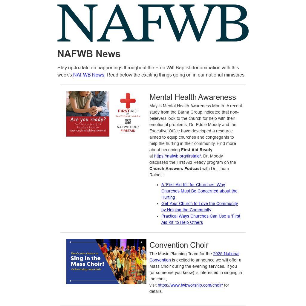 May is Mental Health Awareness Month. A recent study from the Barna Group indicated that non-believers look to the church for help with their emotional problems. Dr. Eddie Moody and the Executive Office have developed a resource aimed to equip churches and congregants to help the hurting in their community. Find more about becoming First Aid Ready at https://nafwb.org/firstaid/. Dr. Moody discussed the First Aid Ready program on the Church Answers Podcast with Dr. Thom Rainer:
