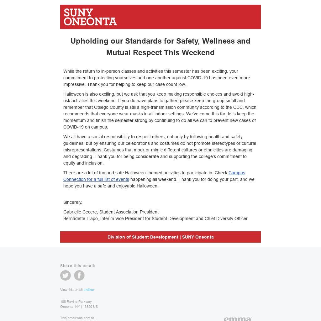 Halloween is also exciting, but we ask that you keep making responsible choices and avoid high-risk activities this weekend. If you do have plans to gather, please keep the group small and remember that Otsego County is still a high-transmission community according to the CDC, which recommends that everyone wear masks in all indoor settings. We’ve come this far, let’s keep the momentum and finish the semester strong by continuing to do all we can to prevent new cases of COVID-19 on campus.