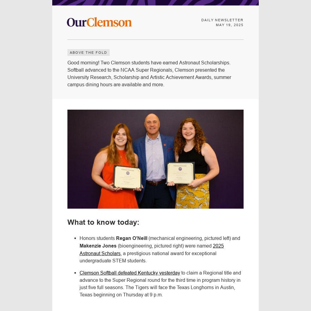 Good morning! Two Clemson students have earned Astronaut Scholarships. Softball advanced to the NCAA Super Regionals, Clemson presented the University Research, Scholarship and Artistic Achievement Awards, summer campus dining hours are available and more.