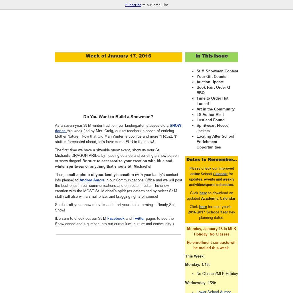 Then, email a photo of your family's creation (with your family's contact info please) to Andrea Amore in our Communications Office and we will post the best ones in our communications and on social media. The snow creation with the MOST St. Michael's spirit (as determined by select St M staff) will also win a small prize, and bragging rights of course!