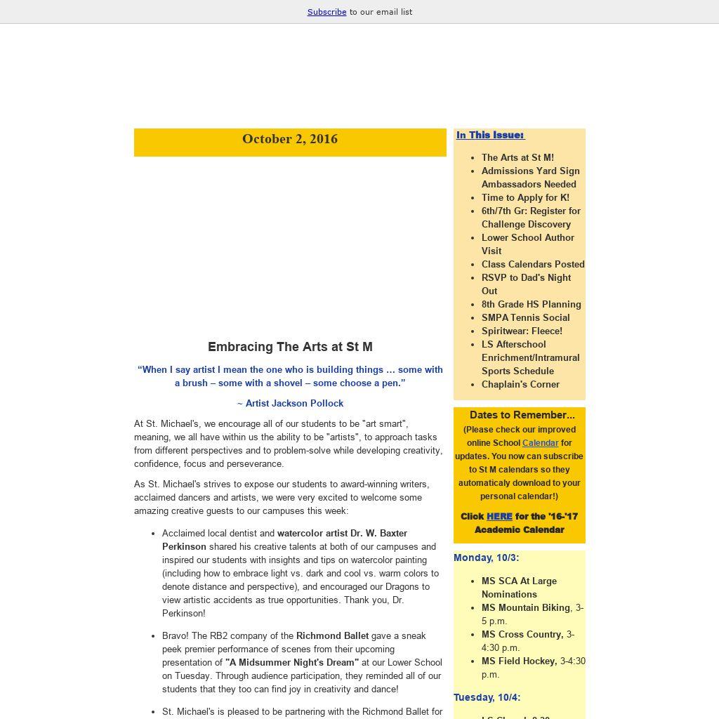 | Dates to Remember...(Please check our improved online School Calendar for updates. You now can subscribe to St M calendars so they automaticaly download to your personal calendar!) Click HERE for the '16-'17 Academic Calendar