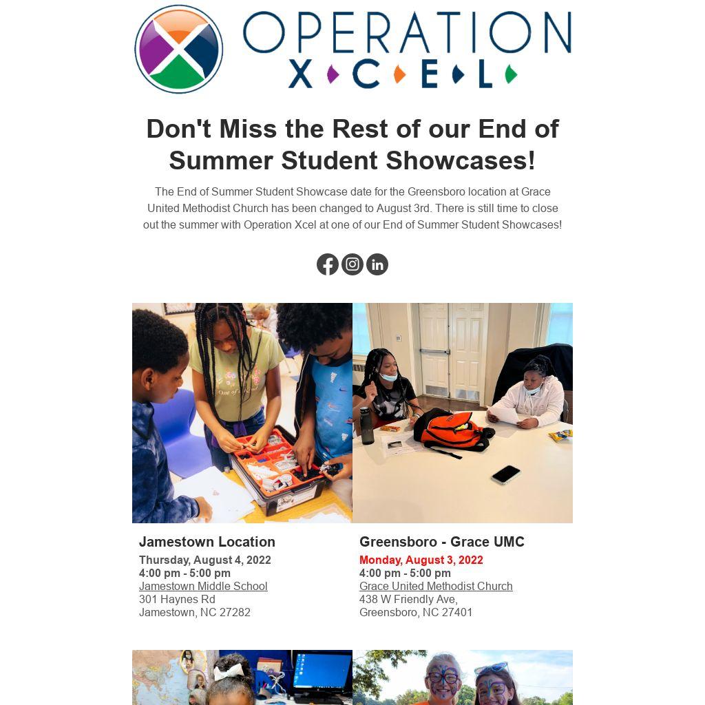The End of Summer Student Showcase date for the Greensboro location at Grace United Methodist Church has been changed to August 3rd. There is still time to close out the summer with Operation Xcel at one of our End of Summer Student Showcases!