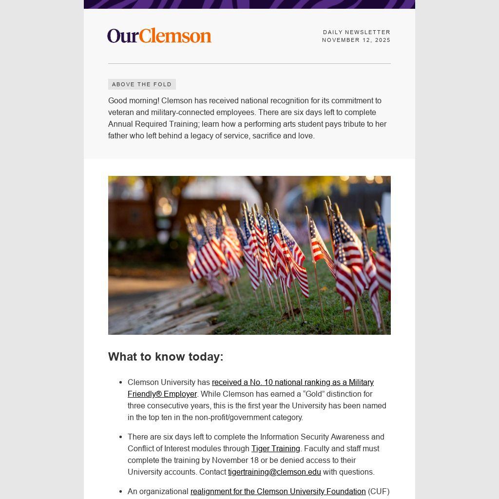 Good morning! Clemson has received national recognition for its commitment to veteran and military-connected employees. There are six days left to complete Annual Required Training; learn how a performing arts student pays tribute to her father who left behind a legacy of service, sacrifice and love.