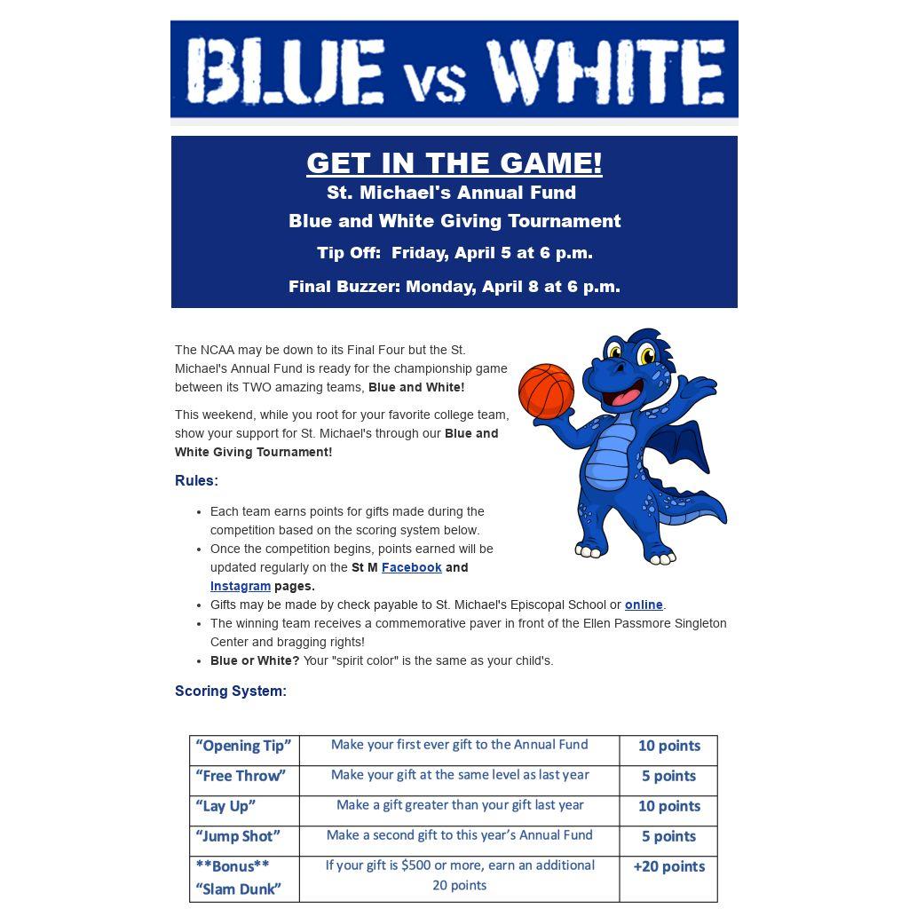 The NCAA may be down to its Final Four but the St. Michael's Annual Fund is ready for the championship game between its TWO amazing teams, Blue and White!